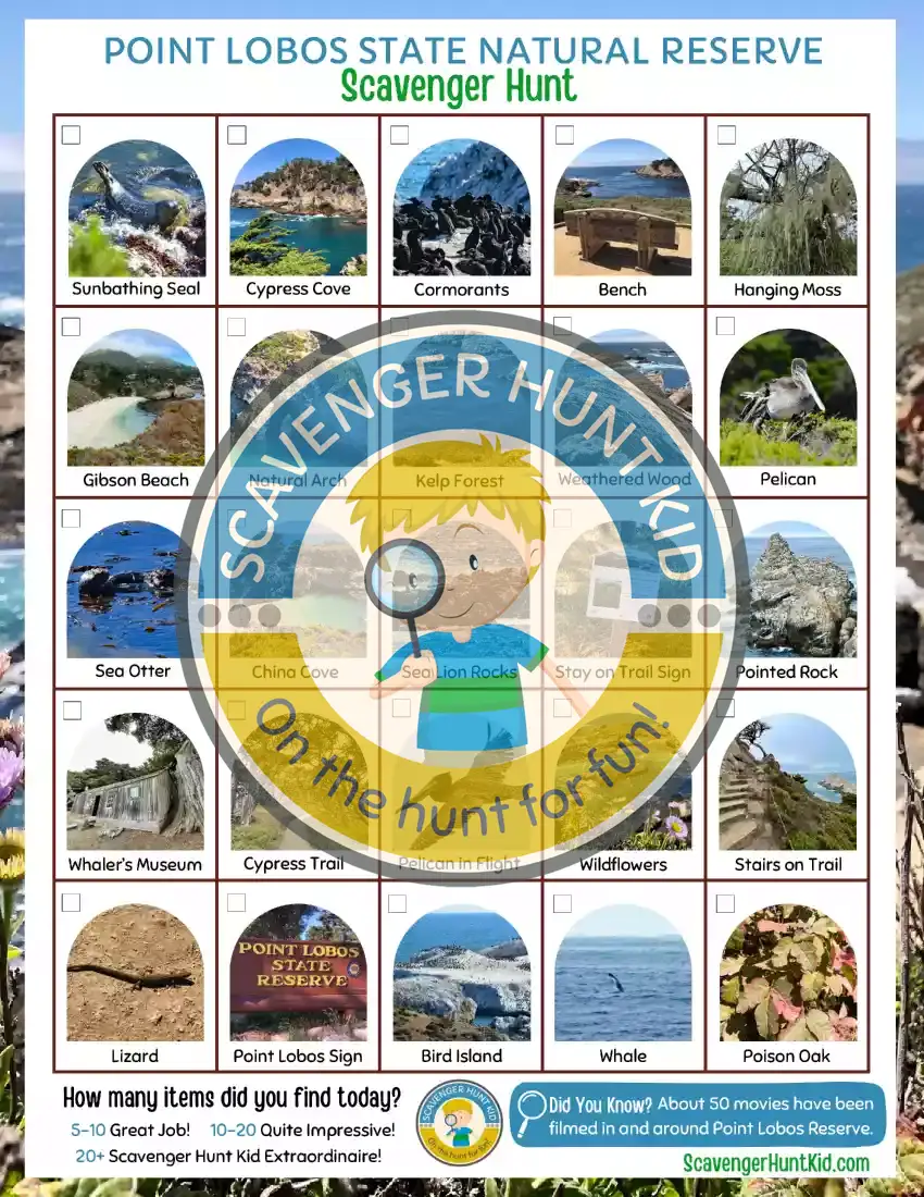 Point Lobos Natural State Reserve should definitely be on the itinerary for your family’s drive along California’s Highway One. Enhance your visit to this breathtaking coastal haven with our Point Lobos Scavenger Hunt. Wander the well-trodden Cypress Grove and North Shore Trails in search of stunning views and resident marine animals such as seals, sea lions, and otters.